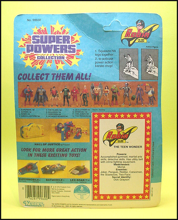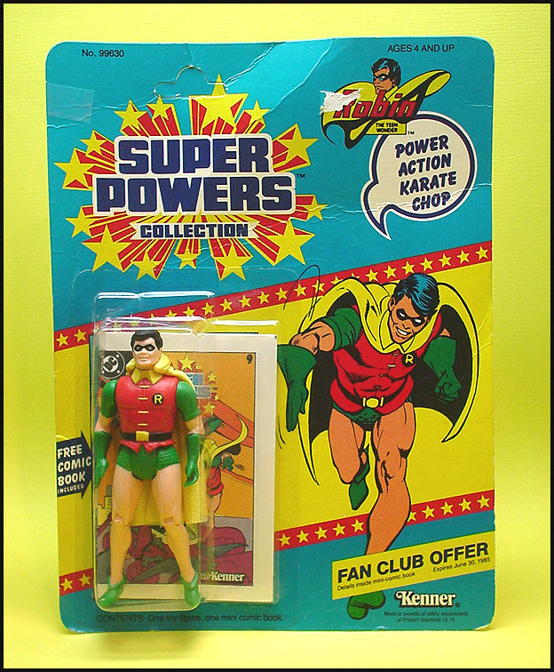 Kenner released Robin on all three card styles for the 1st series action figure assortment. One of the three, shown above, is the 12-back card containing the "Fan Club Offer". While the card front contains a text offer banner in the lower right corner, the card back lacks any offer information. Instead, promotion details reside inside the mini-comic premium's inside front cover. Proof of purchase submission was not necessary for this promotion's redemption. Instead, the offer required submission of the "application" cut from the mini-comic or a 3" x 5" card containing name, address, and birthday (the same information requested on the "application") and a $3.00 check or money order by June 30, 1985. The Fan Club Offer Kit contained: charter membership certificate, color sticker, newsletter, deluxe patch, color photo, and reduced rate DC Comics subscription information. Kenner continued this promotion on 2nd series "Fan Club Offer" card styles, however the expiration date located on the card front's banner was updated to read June 30, 1986.