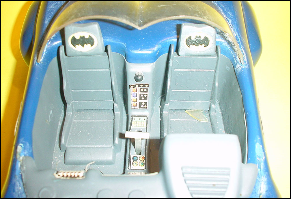 The previsouly mentioned shifting rod is clearly visible from this cockpit close-up shot. All of the cockpit decals are hand cut and hand applied. Attention to detail is clearly present as evidenced by the hand painted bat symbols present on each seat.