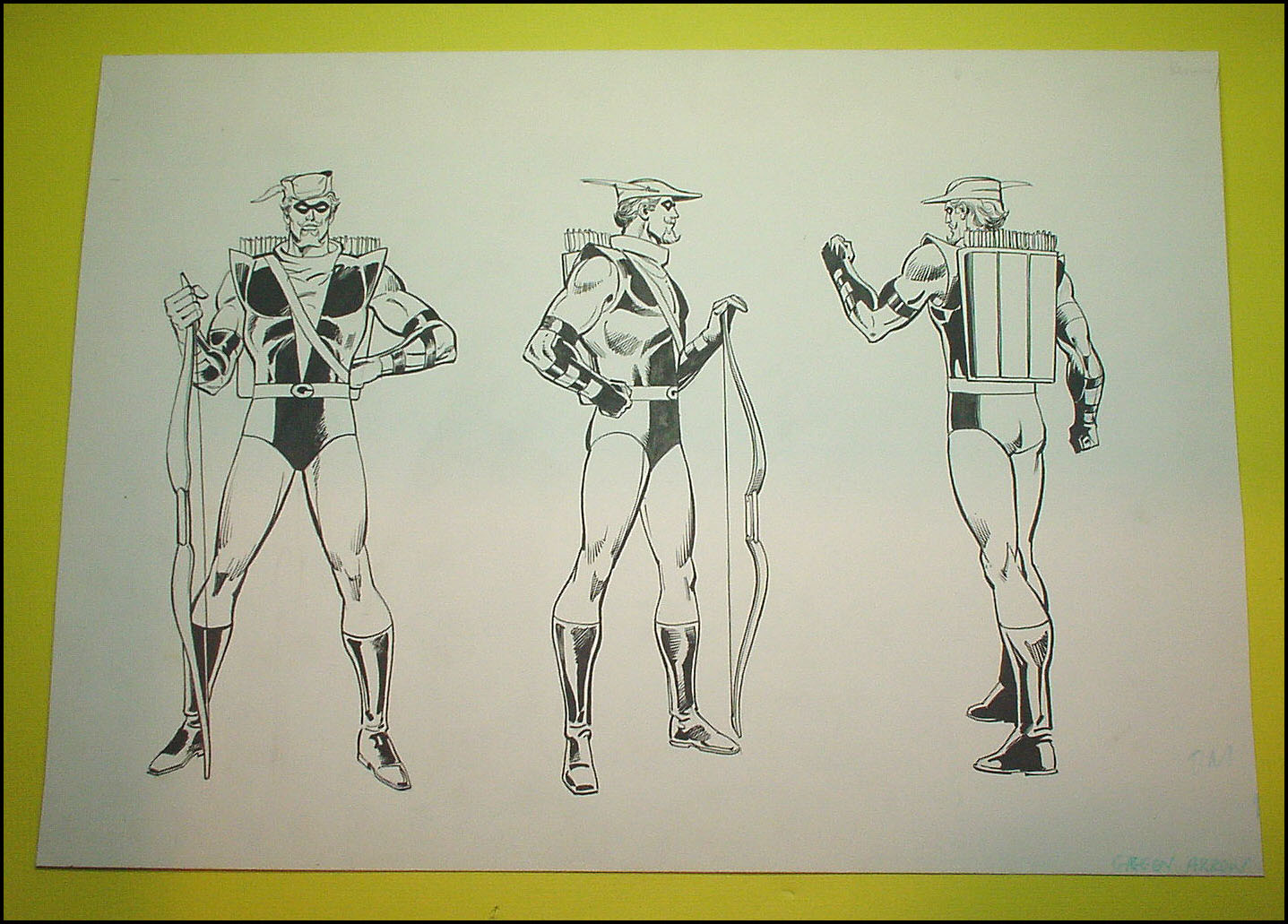 The original artwork showcased above is true original art meaning it is hand-rendered in pencil with inking over top of the pencils. The full size comic art board features three images of Green Arrow; a front image, side image, and back image. This original artwork was copied and scaled down in size to generate portions of internal presentation artwork boards like the Darkseid seen here for internal Kenner use related to the Super Powers toy line.