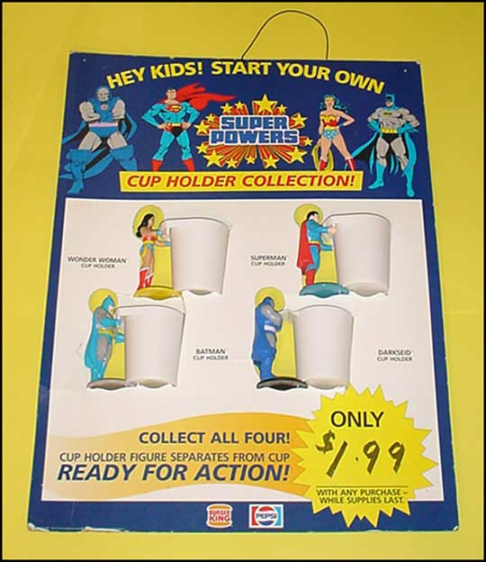 Burger King ran a series of two Super Powers promotions during the mid-80's. One such promotion featured four figural cups. The mobile display seen here served to illustrate each of the 4 cups available during the promotion: Superman, Batman, Wonder Woman, and Darkseid. The mobile graphics are the same on both sides. Four open spaces in the display allow for figural cup insertion. Since the edges around the spaces hug the figural cups in the middle, both sides of the figural cups can be seen as the display pivots on a black string. A graphically similar counter display also exists for the promotion and may be viewed here.
