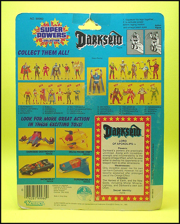 Kenner Canada released 31 of the 33 carded Super Powers figures in bilingual packaging featuring both English and French text to comply with bilingual packaging laws in the country. As such, Darkseid saw release on a single Kenner Canada card style: