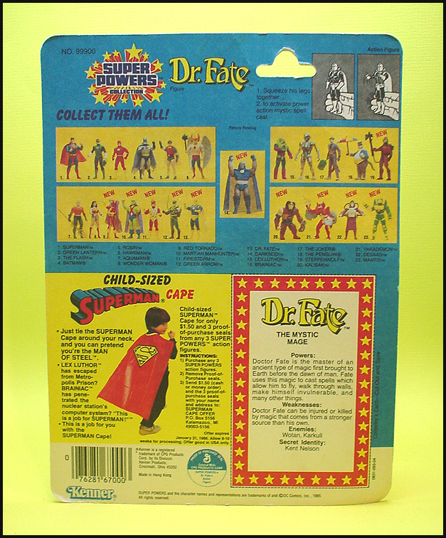 Dr. Fate along with four other heroes and six villains comprised Kenner's 1985 2nd series figure wave. Expertly rendered true to the D.C. Comics character, Dr. Fate featured a "Mystic Spell Cast" power action. Dr. Fate shipped exclusively on 2nd series card styles. While Kenner intended to re-release all early figures in conjunction with the 1986 third series wave, Dr. Fate has not been documented as being released on the 33-back offerless card style. An existing proof card and prototype carded sample provide evidence of the character's intended 3rd series re-release. Dr. Fate's release is documented on the following three domestic (US) Kenner card types: