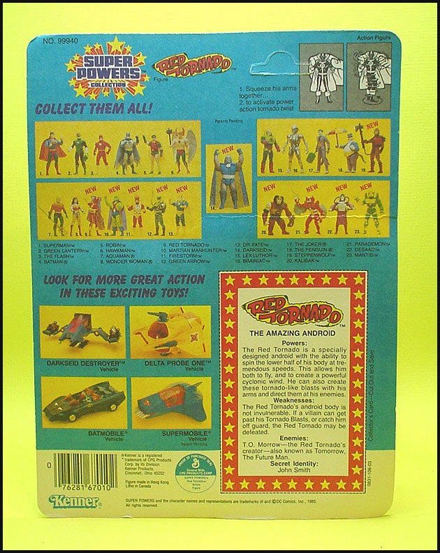 Red Tornado along with four other heroes and six villains comprised Kenner's 1985 2nd series figure wave. Kenner sculptors exquisitely rendered the character in three-dimensional action figure form and designed the toy to include a "Tornado Twist" power action where squeezing the right arm caused the figure's lower half to twist back and forth. Although Red Tornado debuted in the 2nd series line-up, he along with six other 2nd series characters were reissued on 33-back offerless cards and shipped as part of the final 3rd series wave. Red Tornado remains the single rarest of the eleven 3rd series re-release characters. Red Tornado's release is documented on the following five domestic (US) Kenner card types: