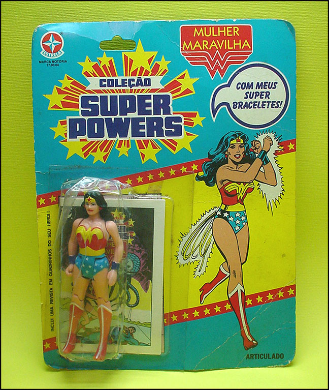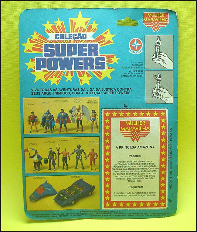 Estrela released its Super Powers, or "Colecao Super Powers" as the packaging illustrates, action figure line for the Brazilian market. The Estrela line, while not as robust as Kenner's, consisted of seventeen figures upon completion of the line. While Estrela released all twelve first series characters, only two from the second series (Green Arrow and Darkseid) and three from the third series (Cyborg, Plastic Man, and Shazam) were ultimately produced. Estrela mimicked Kenner in offering free in-pack mini-comics with each carded figure, but deviated substantially through mini-comic inclusion with the three third series characters.