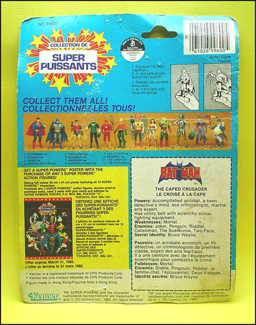 Kenner Canada produced two 12-Back card styles for the twelve 1st series action figures. The carded Batman shown above illustrates one of the two styles: the "Free Poster Offer" variety. The "Free Figure Offer" (Steppenwolf) represents the other Kenner Canada 1st series card style. While Kenner required submission of only two proof-of-purchase seals for free poster redemption by December 31, 1984, Kenner Canada required submission of three proof-of-purchase seals by March 31, 1985.