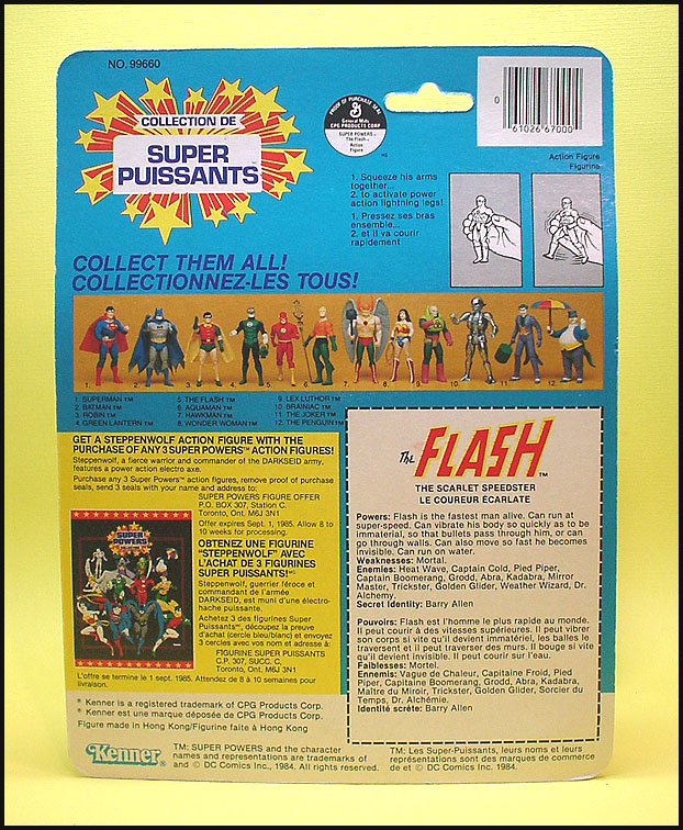 Kenner Canada produced two 12-Back card styles for the twelve 1st series action figures. The carded Flash shown above illustrates one of the two styles: the "Free Figure Offer" variety. The "Free Poster Offer" represents the other Kenner Canada 1st series card style. While Kenner required submission of five proof-of-purchase seals for Steppenwolf redemption by June 1, 1985, Kenner Canada required submission of only three proof-of-purchase seals by September 1, 1985. Kenner Canada's cardback offer details make no mention of the Darkseid record and rebate coupon inclusion, which may explain the lower proof-of-purchase seal redemption requirement. Unlike Kenner, Kenner Canada opted against branding the rear card face with new Steppenwolf promotion offer imagery. Instead the "Free Poster Offer" advertising section simply featured updated text pertinent to the Steppenwolf offer. All 12 first series characters have been documented in this packaging style.