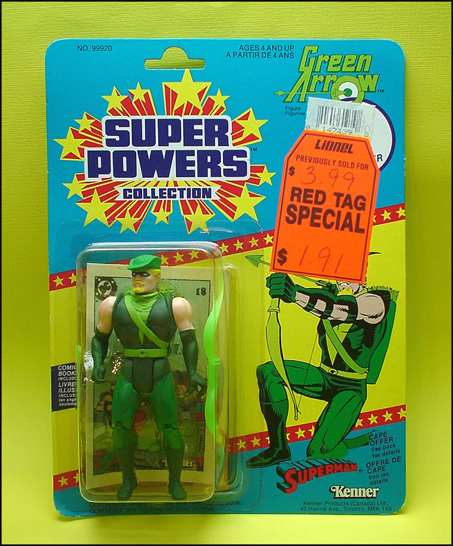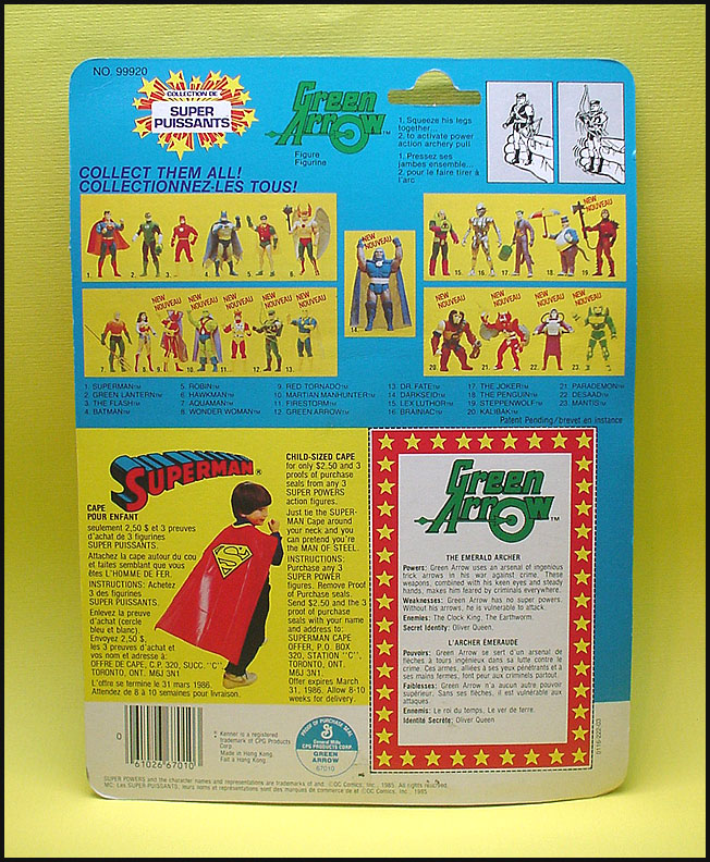 Kenner Canada produced a single 23-Back card style for the eleven 2nd series action figures. The carded Green Arrow shown above illustrates that lone style: the "Superman Cape Offer" variety. Interestingly, the twelve first series characters do not appear to have seen release in this 2nd series packaging. The back side of Kenner Canada carded figures are interesting, and in some ways more pleasing than Kenner's, due to the glossy finish employed on them. While Kenner moved to the glossy back finish for it's 3rd series packaging, the company primarily used a matte finish on the backs. Kenner Canada on the other hand utilized the glossy back finish on 1st, 2nd, and 3rd series cards.