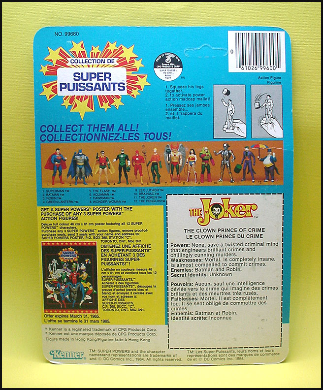 Kenner Canada produced two 12-Back card styles for the twelve 1st series action figures. The carded Joker shown above illustrates one of the two styles: the "Free Poster Offer" variety. The "Free Figure Offer" (Steppenwolf) represents the other Kenner Canada 1st series card style. While Kenner required submission of only two proof-of-purchase seals for free poster redemption by December 31, 1984, Kenner Canada required submission of three proof-of-purchase seals by March 31, 1985. To date I've been able to document 11 of the 12 first series characters in this packaging style. It's quite possible all twelve were released, so research and documentation is still considered ongoing.