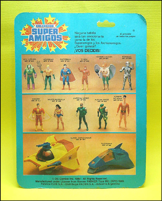 first series characters, two second series characters, three third series characters, and an exclusive Riddler (also released by Play Ful). The Pacipa Super Amigos cardbacks feature Hawkman and Wonder Woman, however I've yet to document carded examples of these two characters in Pacipa packaging. Vehicles, like the Delta Probe-1, rounded out the Super Amigos line. The figures produced by Pacipa do not meet the same strict quality paint application, plastic, and