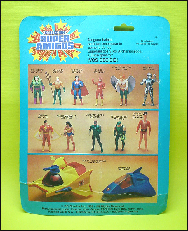 first series characters, two second series characters, three third series characters, and an exclusive Riddler (also released by Play Ful). The Pacipa Super Amigos cardbacks feature Hawkman and Wonder Woman, however I've yet to document carded examples of these two characters in Pacipa packaging. Vehicles, like the Delta Probe-1, rounded out the Super Amigos line. The figures produced by Pacipa do not meet the same strict quality paint application, plastic, and