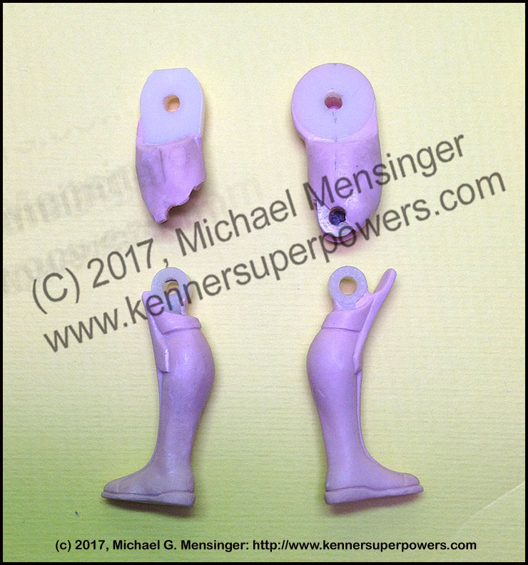The plastic discs are still present in each upper thigh region. These discs serve as attachment and alignment points to ensure an exact fit to the torso. The lower right thigh is missing its connector and shows minor damage, but the figure's left thigh still retains it. You can see part of the connector where a small fragment of wax has chipped away on Cyclotron's left thigh. Each leg piece also contains a plastic component that is incorporated in each lower leg sculpt to ensure a proper fit into the knee area of each thigh.