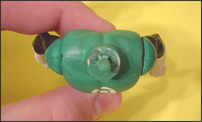 This Green Lantern prototype is entirely hand painted, giving it at great appearance. The arms and legs are fixed in this pose due to the hand application of the paint. Viewers may notice I've labelled this piece as a "hand painted sample", although I've housed it amongst the protomolded (internal first shot) figures. It's related to many of the other protomolded figures and paint masters featured on the site by sharing the same ex-Kenner source origin, which is why I've placed it in this category. This piece is incredible since it features parts from various stages of the production process; the reason pigeon holing it into a single category is difficult as you will soon see.
