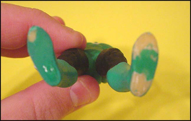The feet lack holes; a characteristic common to hardcopies, protomolded figures, and some first shots. The milky white color clearly gives the legs away as being protomolded (internal first shot). The presense of glue and noticeable paint loss on the foot bottoms suggest this piece served as a display sample at an industry show or possibly a line review meeting. Regardless, it was definitely glued down at one point. The thighs present difficulty in gauging the underlying material since no areas of paint loss exist. Although not 100% clear, parting lines appear to exist suggesting the material might be injection molded plastic like the torso.