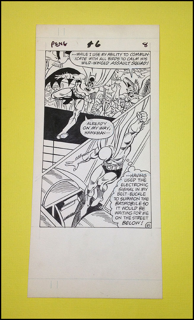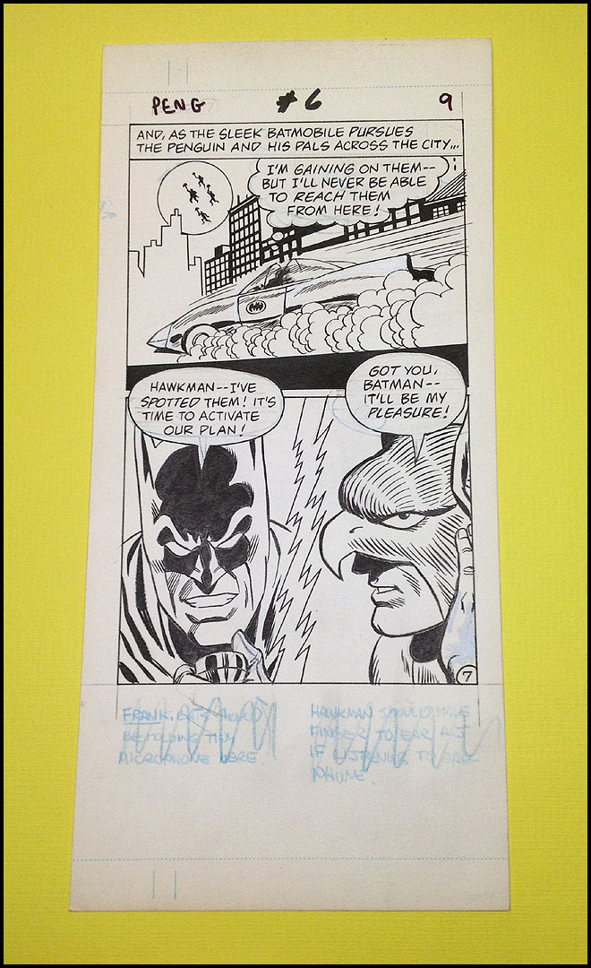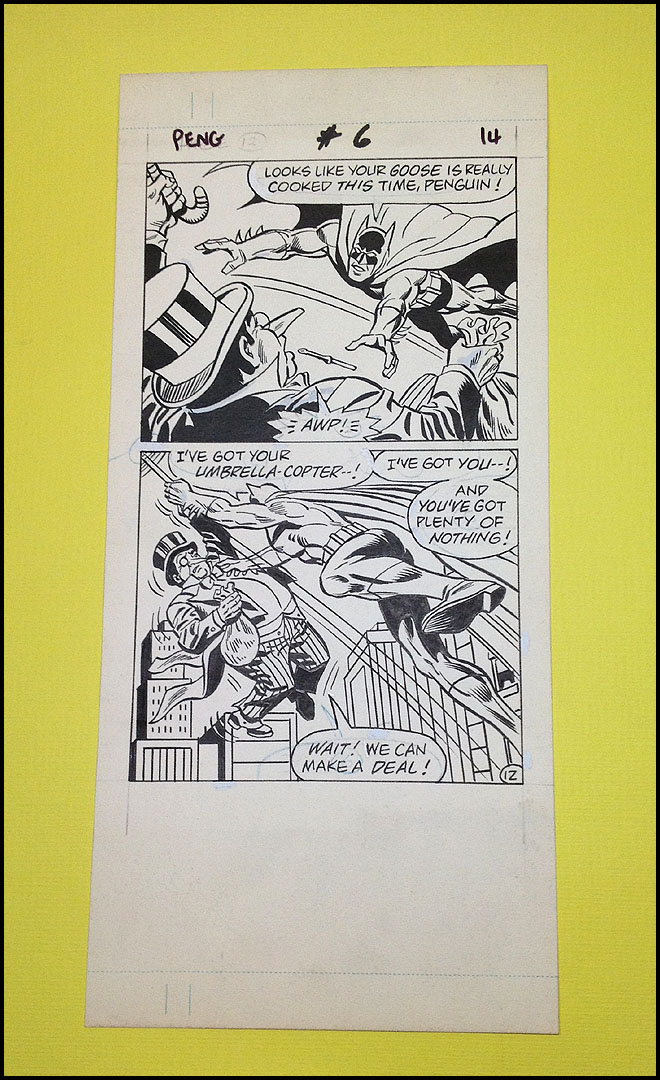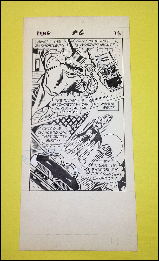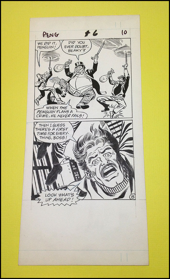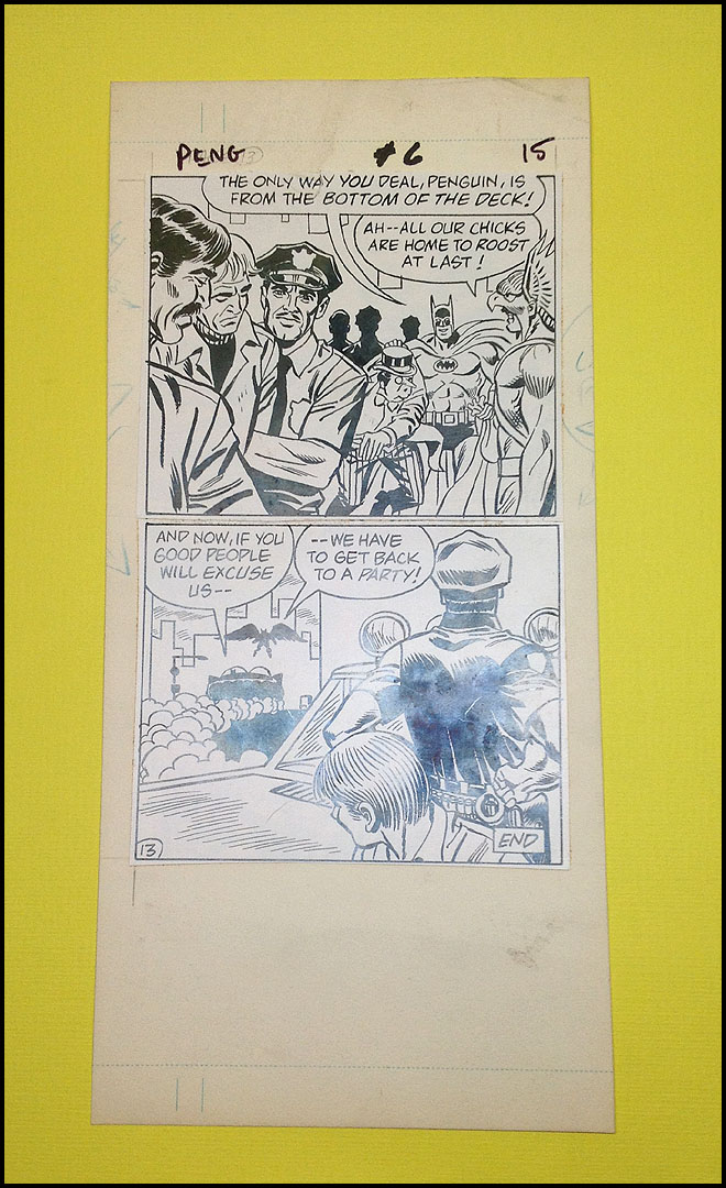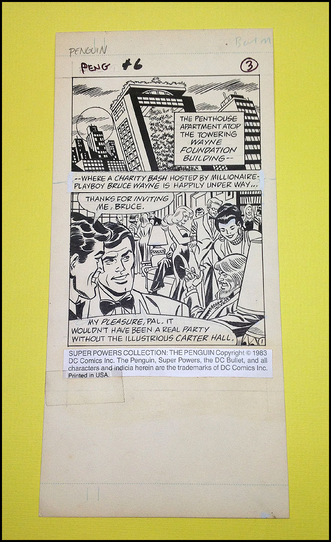 This entry contains images of the artwork used for the complete 13-page Penguin mini-comic interior. A small fraction of the total pages and covers used to create the 23 US mini-comics resides in Super Powers collectors' hands today making this complete interior set of artwork a solid find. When viewing images of the final page (page 13), notice I've shown two images of it. The first image shows the artwork as published with high quality photo stats sitting atop the original artwork. The second image of page 13 shows the actual artwork with the two photostat pieces removed and placed to the right of the artwork. The panels were originally drawn in reverse order, so photostats were created and glued over top the actual artwork to correct that error. This alleviated the need to redraw the page.