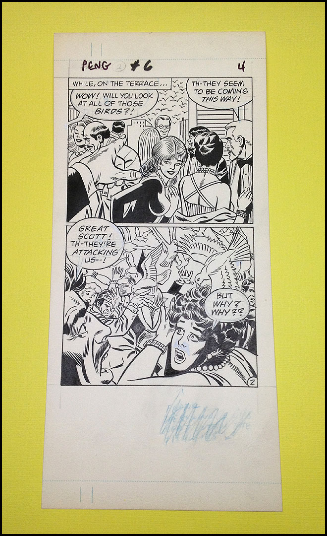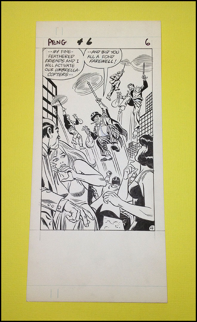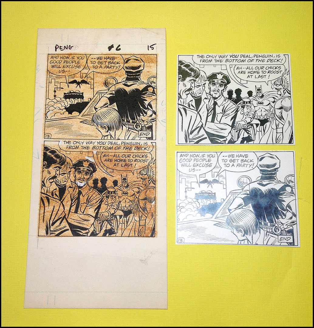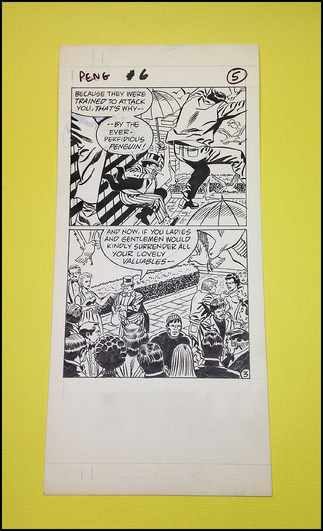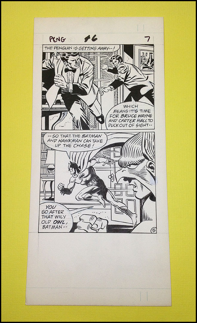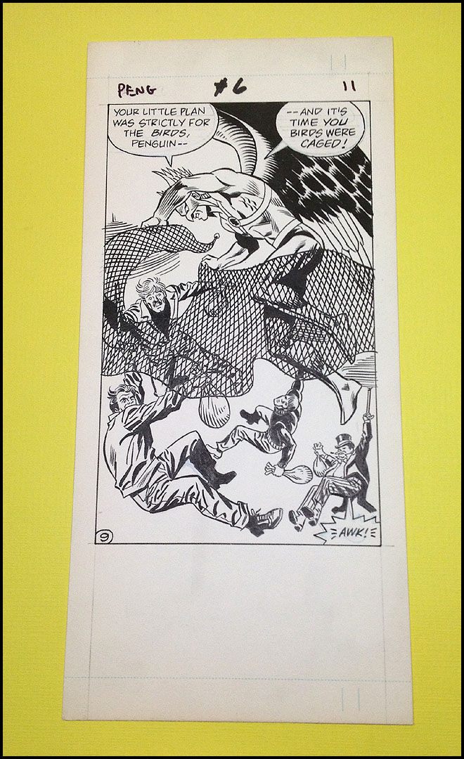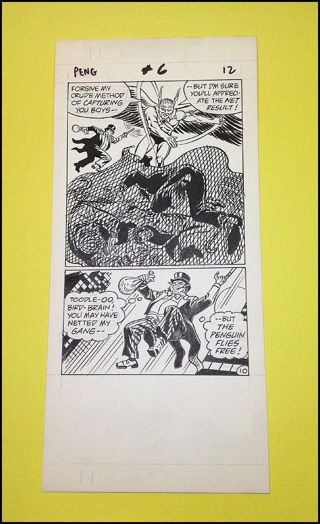 This entry contains images of the artwork used for the complete 13-page Penguin mini-comic interior. A small fraction of the total pages and covers used to create the 23 US mini-comics resides in Super Powers collectors' hands today making this complete interior set of artwork a solid find. When viewing images of the final page (page 13), notice I've shown two images of it. The first image shows the artwork as published with high quality photo stats sitting atop the original artwork. The second image of page 13 shows the actual artwork with the two photostat pieces removed and placed to the right of the artwork. The panels were originally drawn in reverse order, so photostats were created and glued over top the actual artwork to correct that error. This alleviated the need to redraw the page.