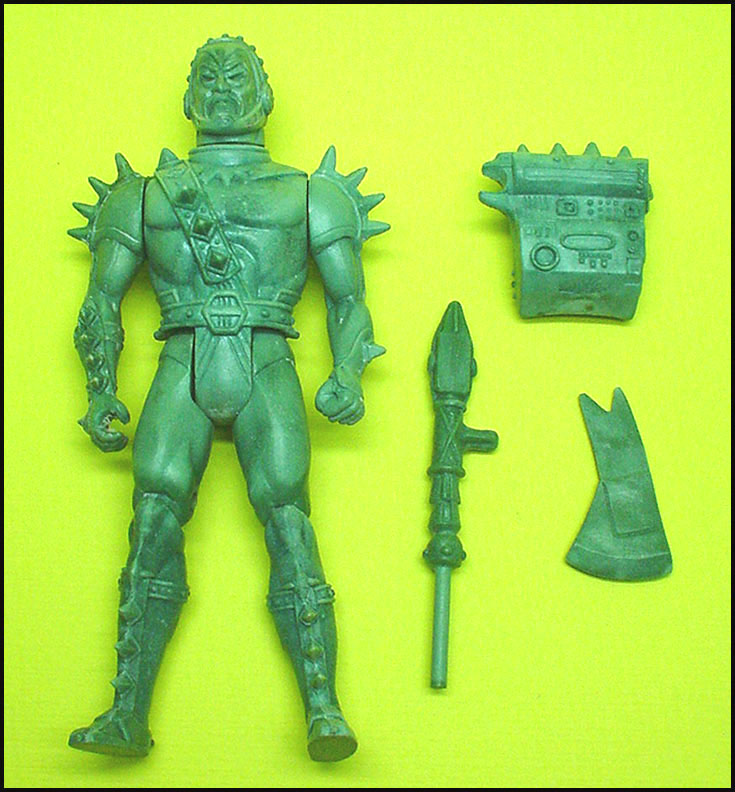The Steppenwolf action figure prototype showcased in this entry is referred to as an unpainted hardcopy. Hardcopies are cast using silicon molds made directly from the original sculpted components. As such, they retain a larger fraction of the intricate detail found in the wax sculpting; some of which is lost in the final injection molded plastic production figure. Urethane color can vary, however the vast majority of Super Powers hardcopies are cast in green urethane referred to as dynacast. Each component of the hardcopy is attached to the torso with cylindrical steel dowel, so the head and limbs are removable from the torso.
