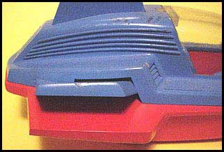 Here we see a side view of the vehicle. You'll immediately notice a huge difference between this and its production counterpart. The conceptual piece has extendable fists on the front, while the produced version had a battering ram type apparatus. The fists are painted silver and can be extended when pulled. They quickly return back since a spring mechanism is attached internally to them. I'm actually surprised they didn't go with this version. The fisted version of the ship was produced in a small and large diecast form by Corgi toys, so consumers probably had exposure to that design. The presence of the fists is by far my favorite aspect of this piece. Another interesting aspect is the side fins. They are cabable of moving up and down. The produced version of course had immoveable fins that simply angled down on the side of the ship.