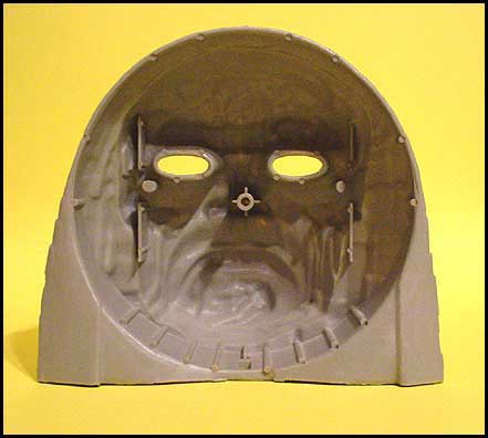 The back view reveals the hollow nature of this head. This was necessary for placement of internal mechanisms related to the torture wheel feature. The torture wheel consisted of a circular disk attached to the back of Darkseid's head. A small arm held any captured hero to the disk for Darkseid's evil interrogations. When the disk turned, it caused a plate behind the eyes to move up or down. This plate consisted of two colors: orange and black. Turning the wheel in one direction moved the plate upwards simulating glowing eyes on Darkseid's head. Turning the wheel in the opposite direction moved the plate again casuing the eye color to change to black.